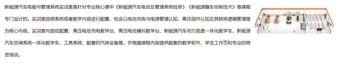 新能源汽车电能与管理系统实训室以充电状的原理认知、结构拆装及调试测试,高压电池部件认知、工作原理、电能转换逻辑,高压线路识别、电动空调工作原理、整车充放电及驱动原理为主要教学内容。以不同的教学任务项目展开为主导,人体工程学为基准依据,建设成为更符合高水平实训室。